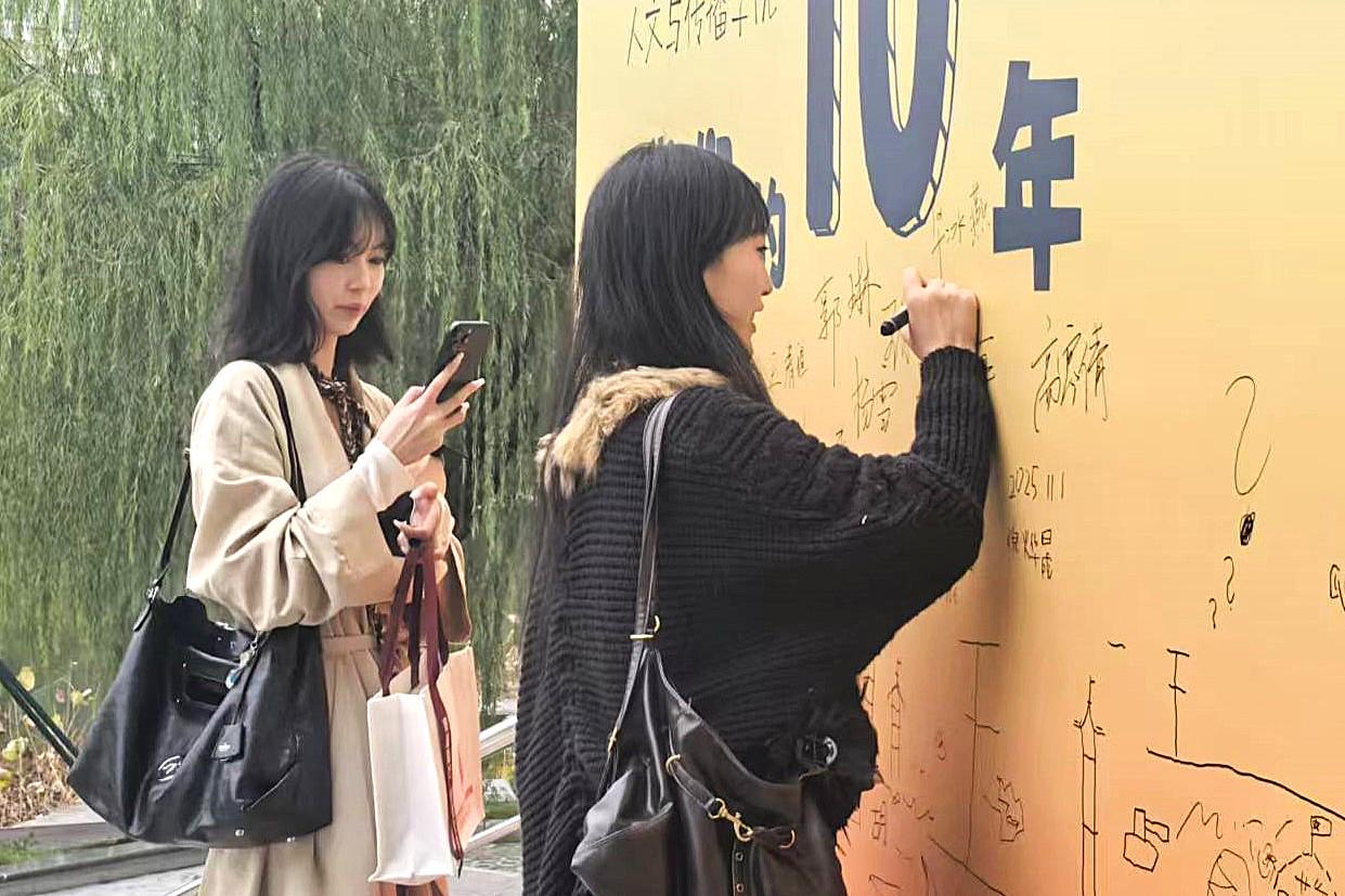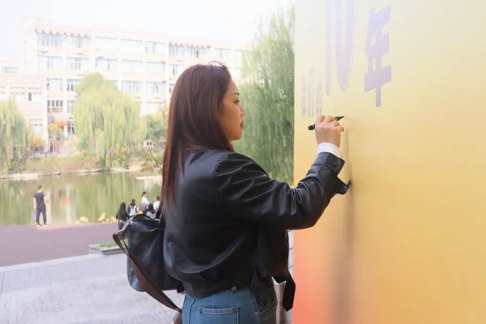 完成签到的校友,还会收到一份独特的人文纪念品,或是刻有学院印记的挂件,或是印有人文符号的明信片。再移步至长廊一侧,便是互动区。校友们执笔蘸彩,俯首书写下十年后的星辰与远方,墨迹在纸端游走,将此刻的心绪与期盼一一封存。