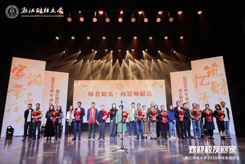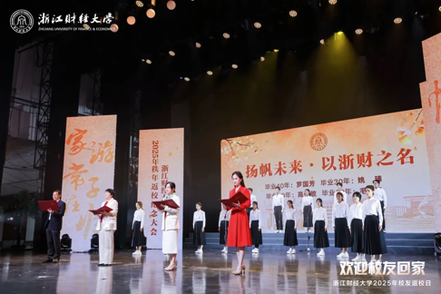 灯光渐柔,温情满场,诗朗诵《以浙财之名》此刻登场。我院2015级汉语言文学专业校友毛瑜华与18名学生代表并肩而立,每一个眼神都藏着对母校的热爱,当 “以浙财之名,承初心之诺,赴未来之约” 的誓言铿锵响起,我们听见了责任的重量。