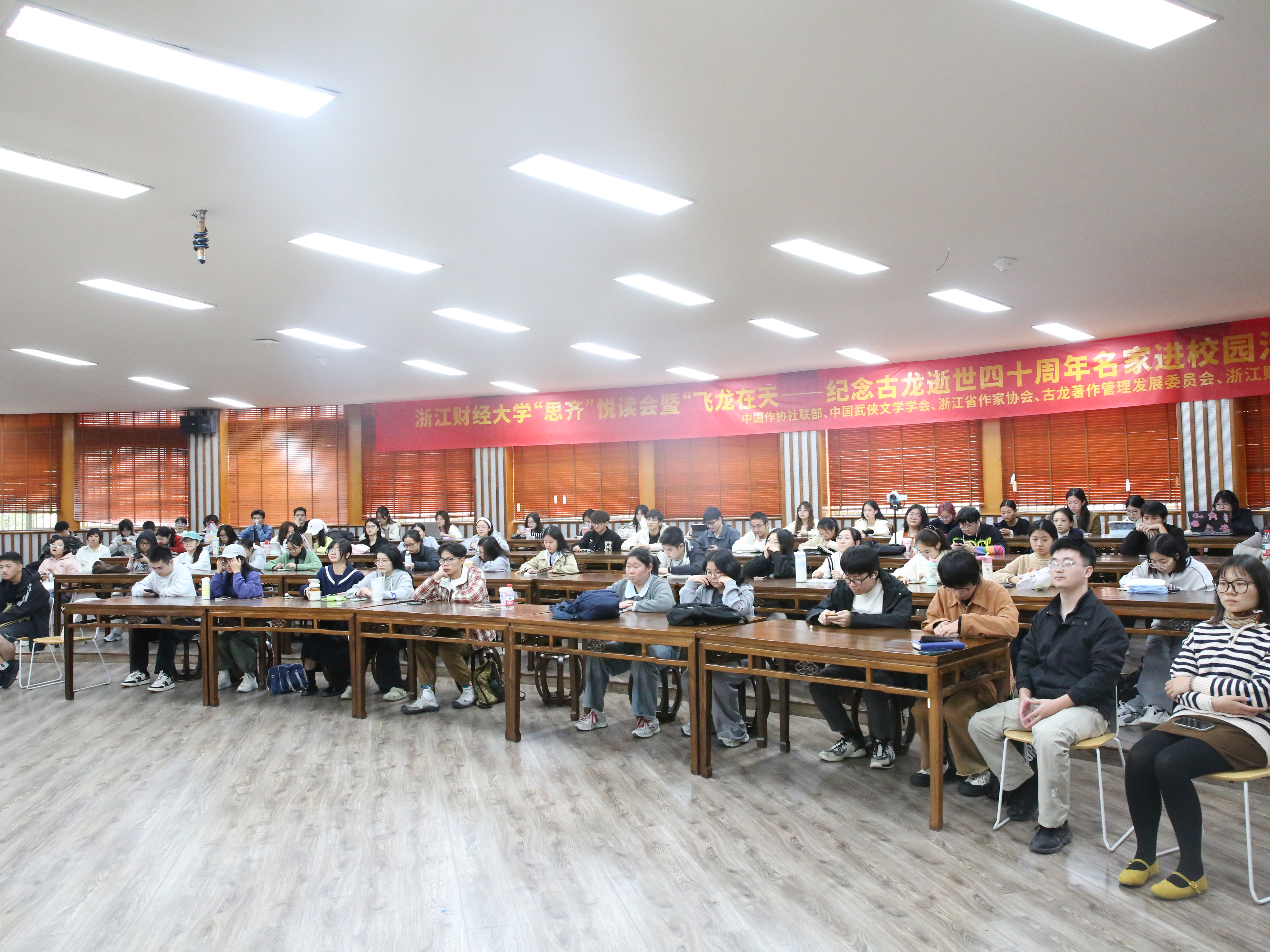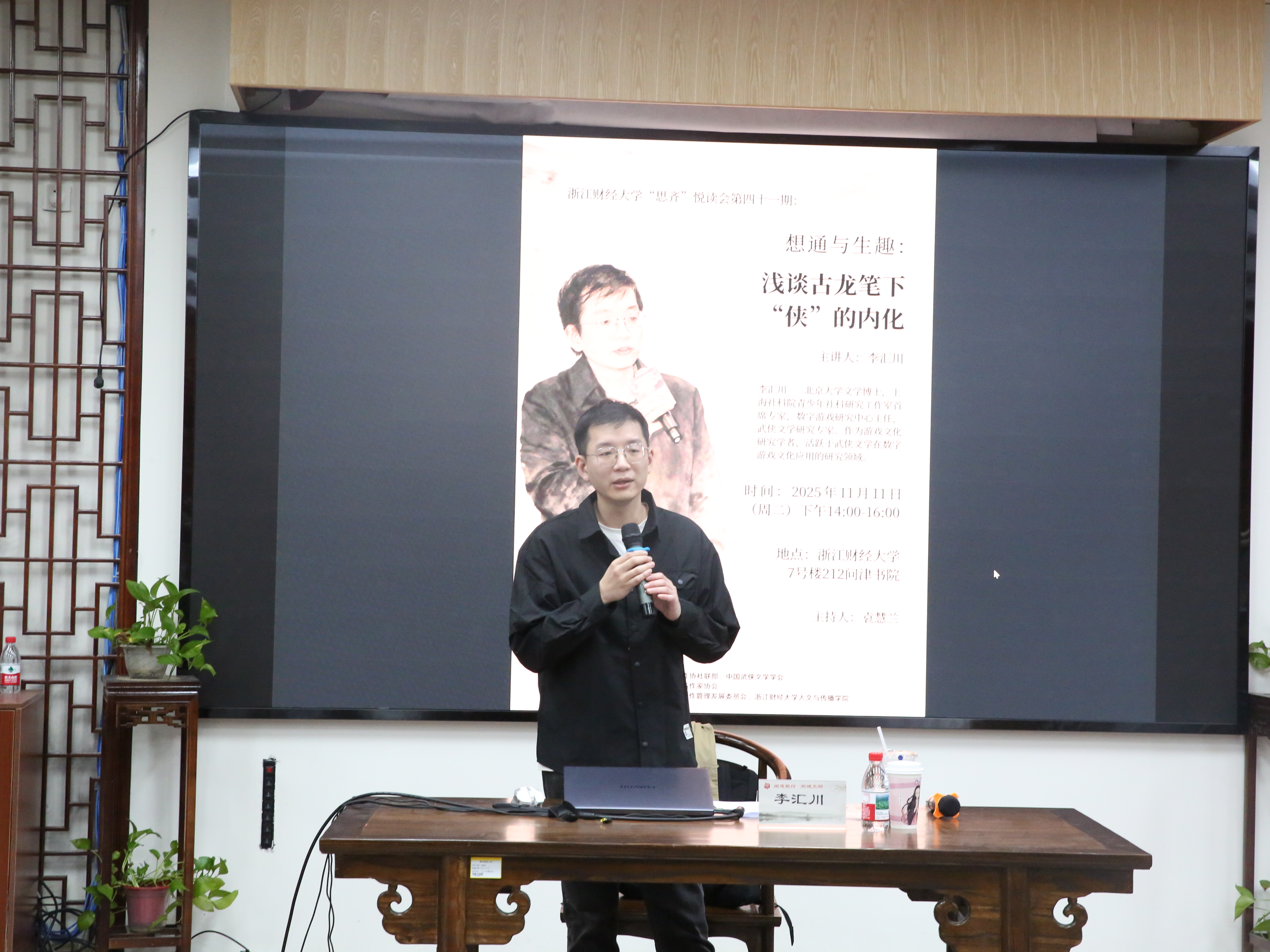 读武侠,是读江湖意气,亦是悟人性真章。为纪念古龙逝世四十周年,11月11日下午,浙江财经大学第四十一期“思齐”悦读会在人文与传播学院问津书院顺利举办。活动特邀北京大学文学博士,上海社科院青少年社科研究工作室首席专家,武侠文学研究专家李汇川主讲,探讨古龙笔下的侠之内核,解码其作品跨越时代的精神魅力,走进古龙的江湖世界,在刀光剑影里读懂“寸心之争”的重量,院党委副书记袁慧兰与七十余名师生共同参与。