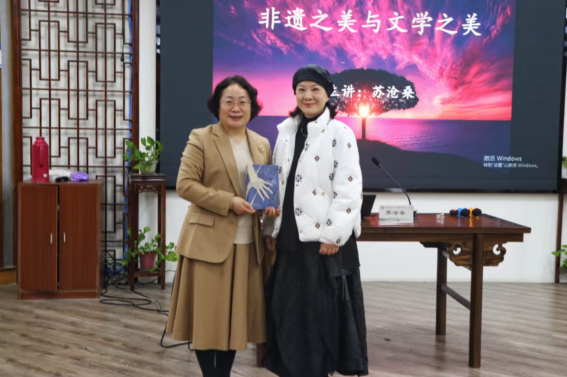在互动环节,在场同学提问道:“我们普通人可以在哪些方面做出自己微小的努力?”苏沧桑答道:“我们普通人不在于要对非遗做出多大贡献,不要求我们成为传承人,只要保持心里那份对非遗的热爱,就算是努力了。”另一位同学提问道:“在文学写作角度,老师您是如何实现美化与现实的平衡的?”苏沧桑答道:“其实很多人都有误区,认为美化与现实是对立的,但实际上两者是相互影响、动态平衡的关系,美化可以让现实被更加深刻的看见。”