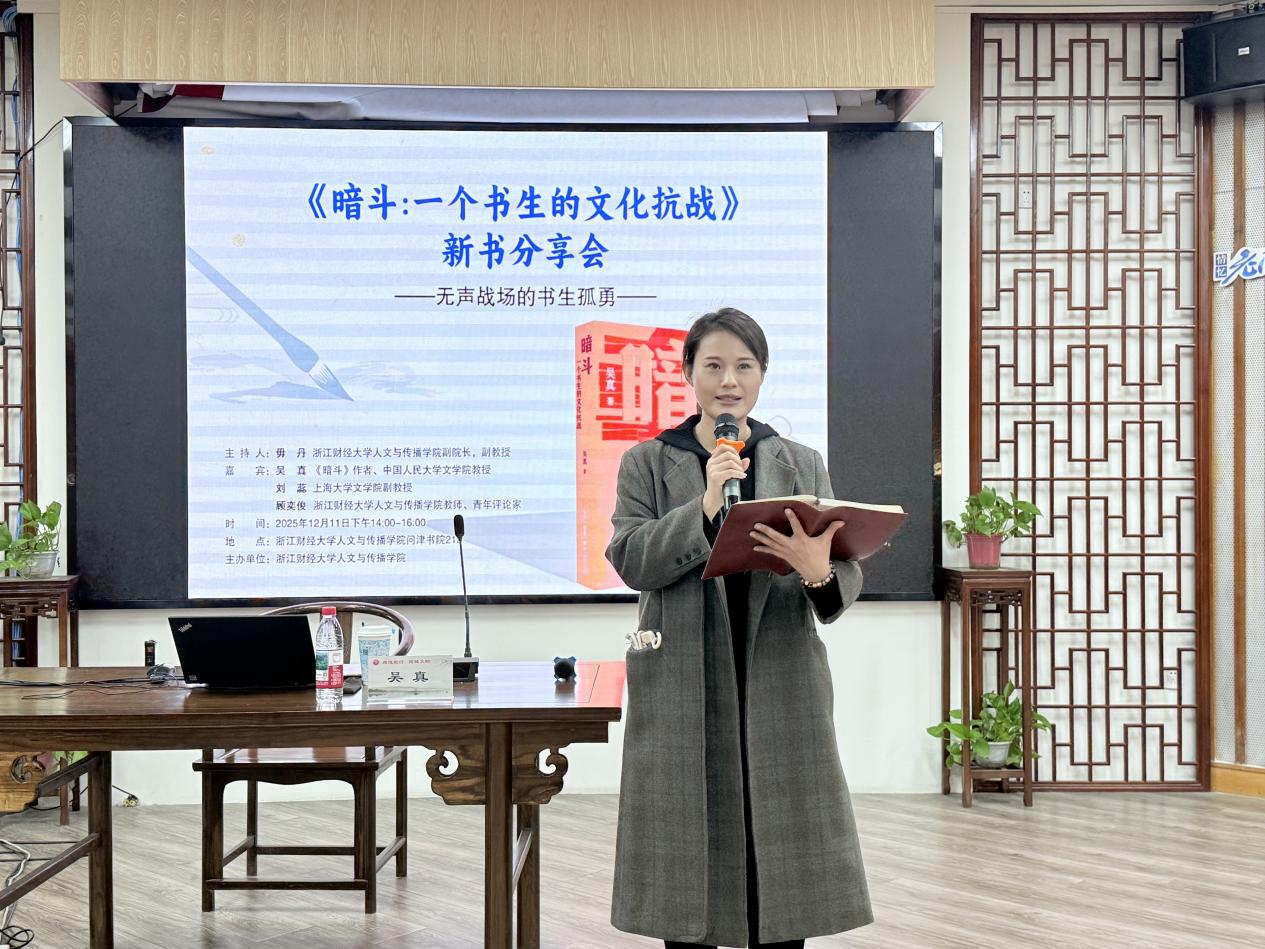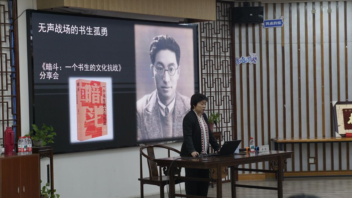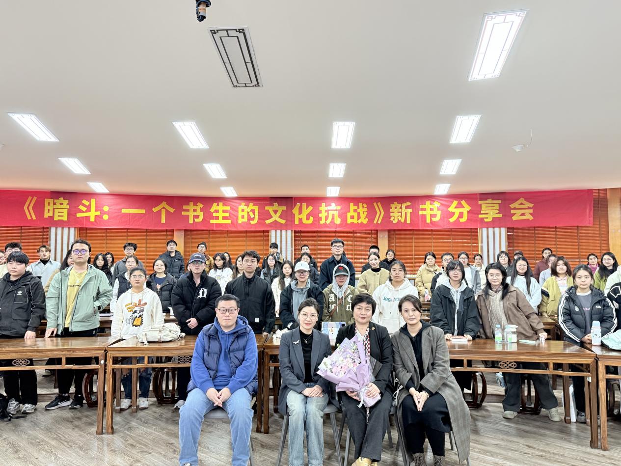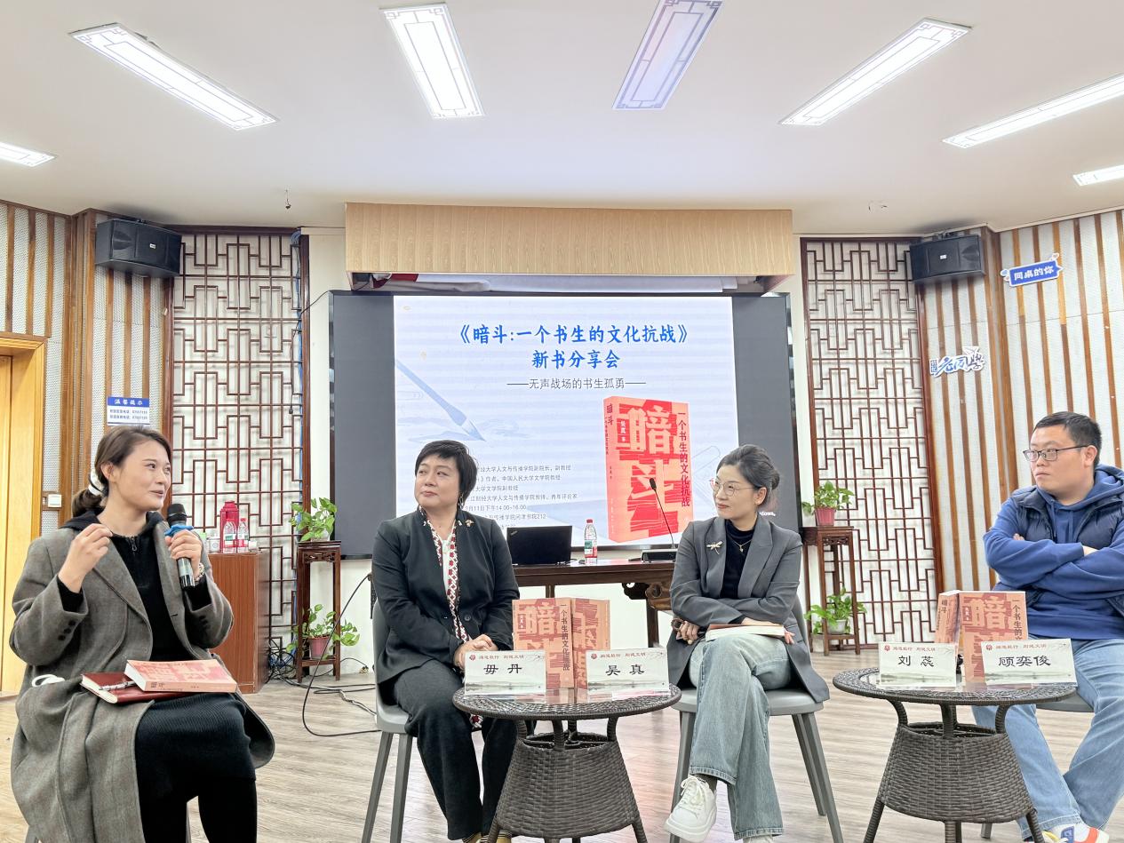12月11日下午,“无声战场的书生孤勇:《暗斗:一个书生的文化抗战》”新书分享会在问津书院成功举行。本次活动特邀本书作者、中国人民大学文学院教授吴真,上海大学人文学院副教授刘蕊,浙江财经大学人文与传播学院教师、青年评论家顾奕俊担任嘉宾,由人文与传播学院副院长毋丹主持,共八十余名师生参与此次活动。