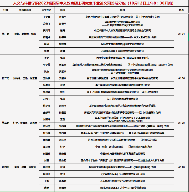 10月12日,人文与传播学院2023级国际中文教育专业硕士学位论文预答辩举行,共有26位研究生参加本次学位论文预答辩。预答辩分为四个小组,每个小组三位答辩专家。答辩地点分别在教学楼A楼的104、106、108、110教室。具体分组情况如下: